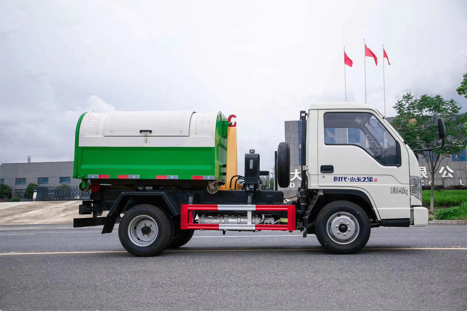 選裝前圍,前柵欄,前LOGO;隨底盤選裝駕駛室,選裝車輛外觀結構樣式.該車用于垃圾的收集清運,主要專用裝置為勾臂;側后防護材料均為Q235,側防護為螺栓連接,后防護為焊接連接;后部防護斷面尺寸(mm):100×50,離地高度350mm;發動機型號/油耗(L/100km)對應關系:Q23-95C60/11.5,Q23-95E60/11.5;ABS系統控制方式為4通道四傳感器,ABS型號為CM4YL,生產廠家為廣州瑞立科密汽車電子股份有限公司.