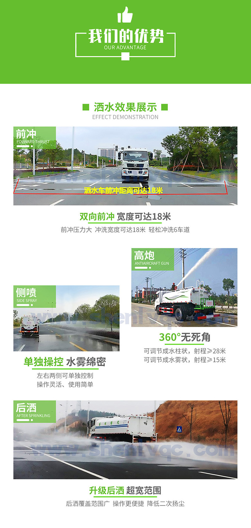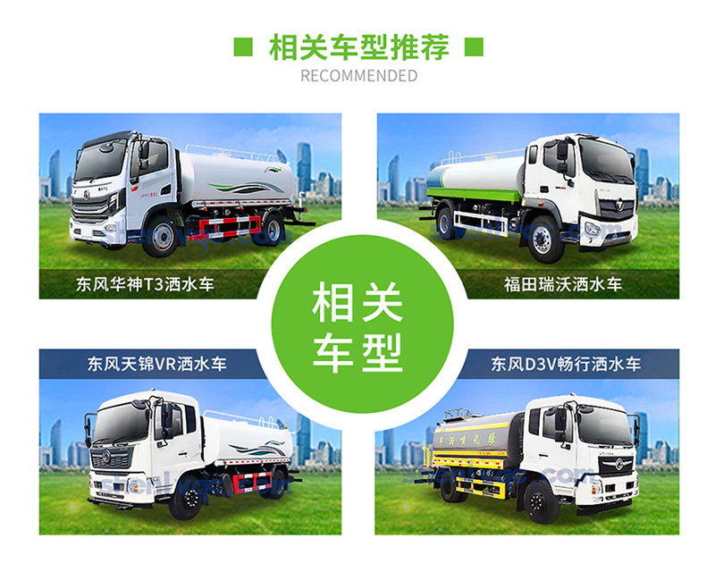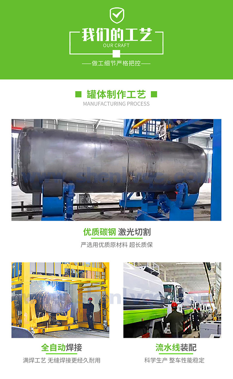 ①大鴨嘴前沖噴頭,萬向前沖球閥;②選裝氣動球閥駕駛室內控制;③選裝自動灑水炮;④選裝LED箭頭燈,長條警燈;⑤選裝食品級304不銹鋼罐體;⑥選裝后加大工作平臺+霧炮機組;⑦選裝新款標準化外形。